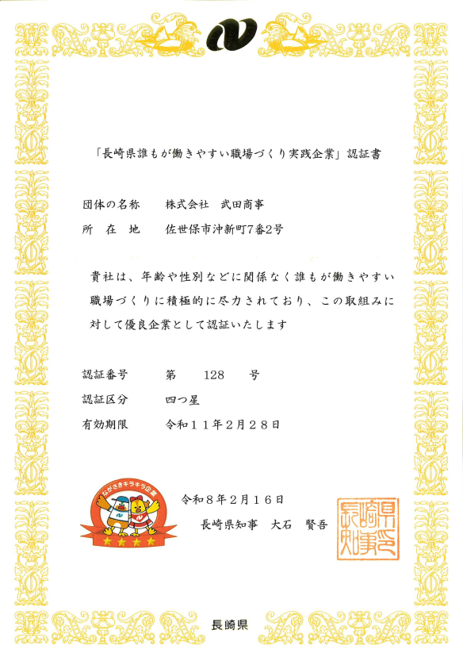 長崎県が認証する「Nぴか(誰もが働きやすい職場づくり実践企業)」において、最高評価に迫る「4つ星」の認証をいただきました。
